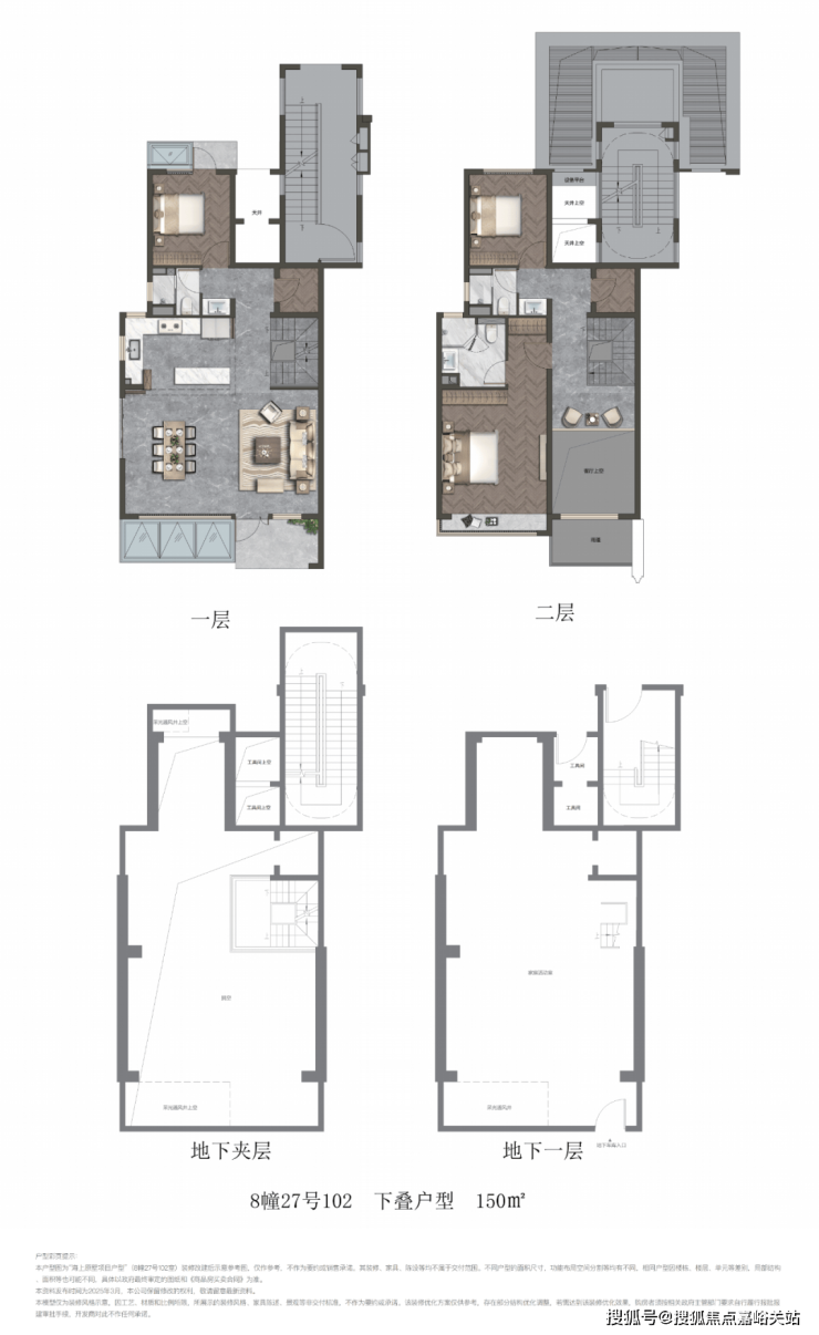 以建面约150㎡ 下叠户型为例: 首层拥有约7.2米的横厅,与南向花园相连;二层的部分区域设计为客厅挑空,让客厅更气派,可以改造为房间增加功能性;地下室层高约5.65米,根据业主喜好设计为酒窖、健身房、SPA室,书房等。