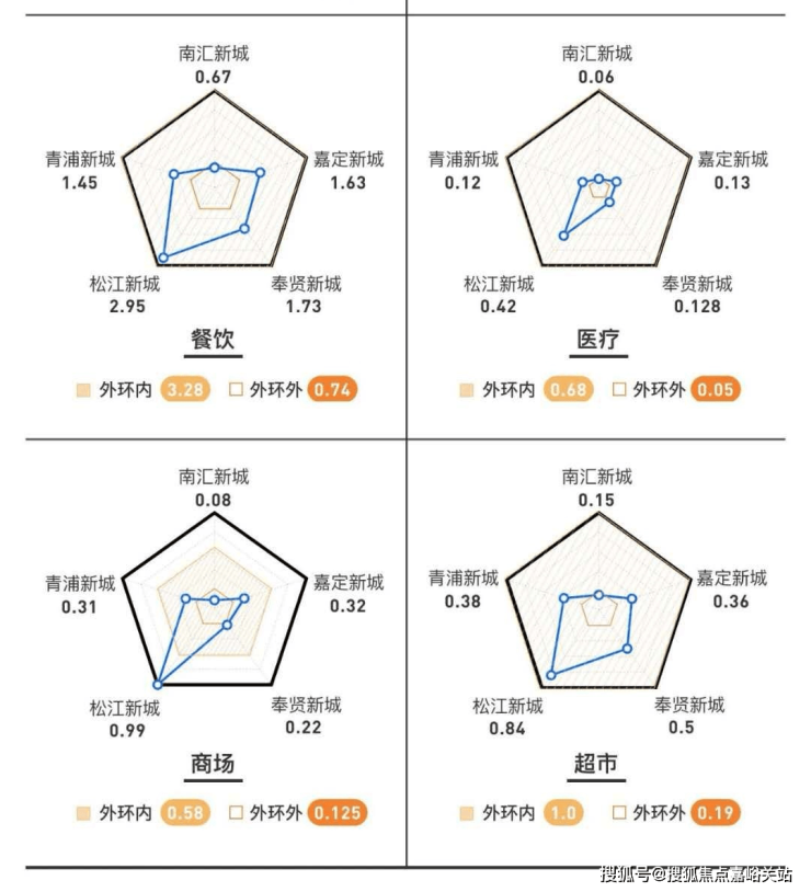 松江新城是上海最早开发的新城,也是最早通地铁的新城,商业医疗等城市配套密集程度在新城中首屈一指,下面这个对比一目了然。