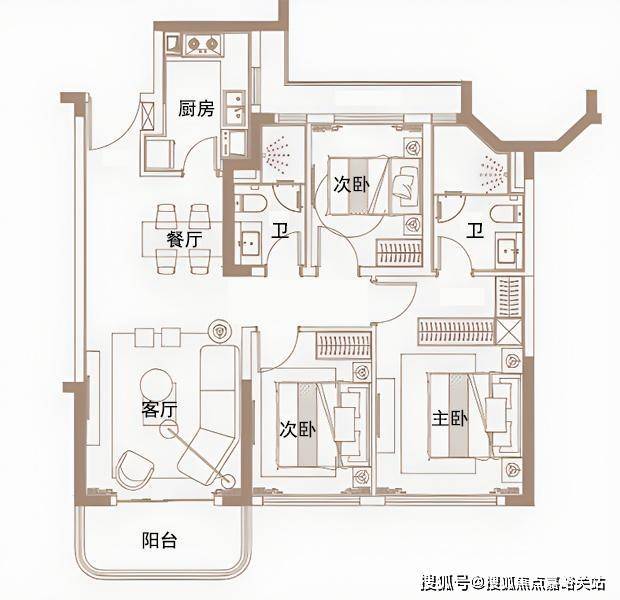 2、舒适度: 从户型图能看出采用的是经典四叶草户型,即4个卧室分别在房屋的四角。这种设计的优势就在于营造了一种即便是一家人,也要有专属私人空间的概念。