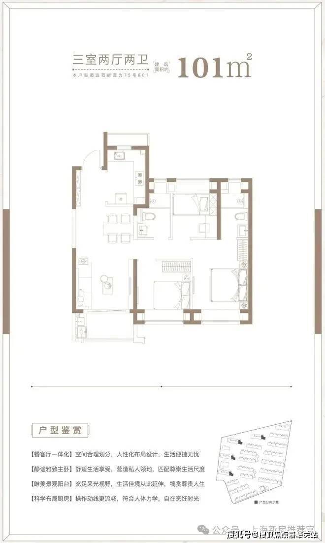 建面约101㎡3房2厅1卫,约101㎡B户型是做到了 三开间朝南+主卧套房设计+动静分离+全卧室带飘窗,采光极佳的大3房。