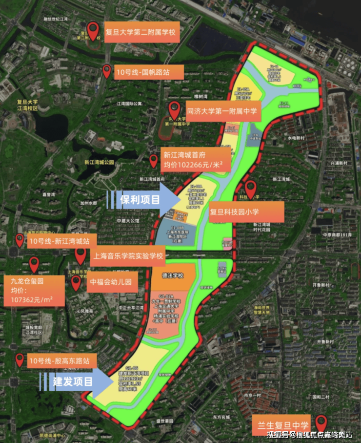 「保利新江湾项目」与「建发新江湾项目」相距不到1公里,临近江湾-五角场主城副中心,附近有中原路、闸殷路、淞沪路、中环线等道路,轨交6号线、8号线、10号线环伺,交通便捷度高;周边有兰生复旦中学(国和路校区)、国和中学、市光中学、国和小学等基础教育设施,1.5公里内有杨浦区中心医院中原分院、市东医院、长海医院。