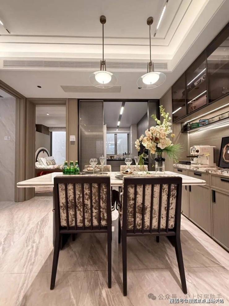 餐厅区域放置一个餐边柜,同样选用了雪山飞狐奢石做透光台面设计,餐边柜在收纳储物方面具有显著作用。