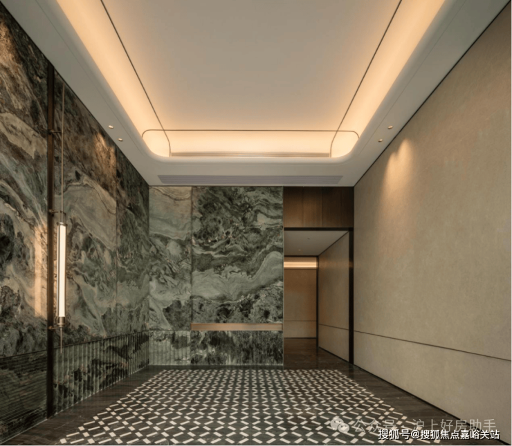 双大堂系统则将尊崇感贯穿于归家动线的每一程。社区主入口大堂以酒店式的空间尺度与艺术化陈设,完成从城市到社区的过渡;单元入户大堂则进一步将仪式感升华,精选雪山飞狐、高山流水等珍稀奢石作为主背景,天然形成的山水纹理宛如艺术画卷。搭配精心设计的艺术吊灯与金属细节,营造出兼具归家温馨感与艺术馆般精致度的“第二客厅”。从公共到私属,双重大堂不仅实现了功能分区,更通过材质与光影的层层递进,完成了情绪上的铺垫与升华。