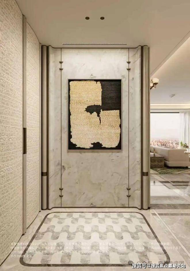 约2㎡玄关拼花采用胜利拱券 ×全水刀工艺!超高压切割让石材切口平整无崩边,结构更稳定,搭配天然石材的高硬度属性,长久使用依旧光洁如新,省去后期维护烦恼。✅保利外滩曜售楼处电话:400-856-9058