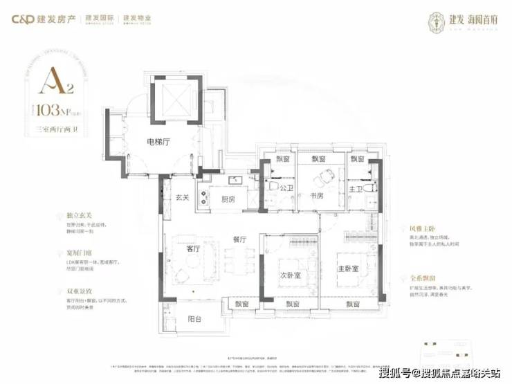 这套 建面约103㎡动静分离户型 打破常规, 兼具三个房间和南向超阔面宽的横厅, 以此承载从二人世界到三代同堂的全生命周期需求。