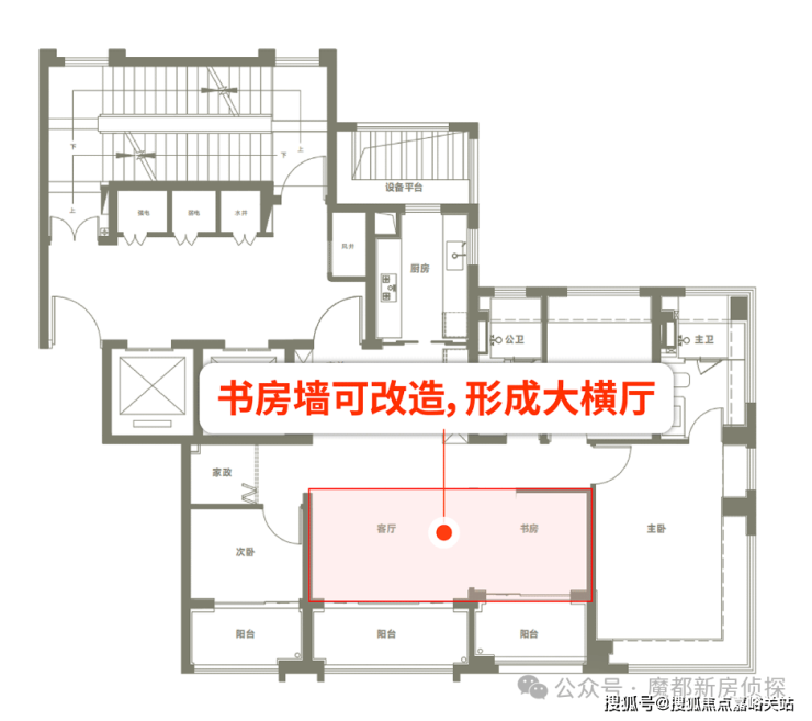 值得一提, 靠近主卧的次卧与客厅之间的墙体可灵动改造,若打通则能形成 约38平超大横厅,相当于常规180平户型客厅尺度,社交与生活场景随心切换。