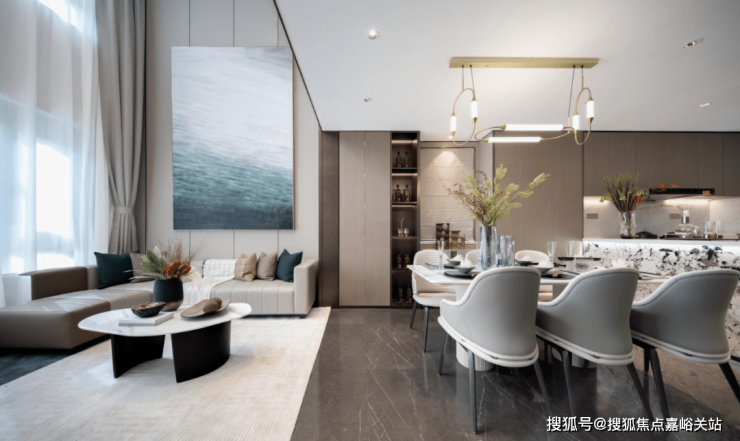 一层主会客,客餐厅一体化设计,客厅开间约4.7米,连上餐厅,整个进深接近7米。