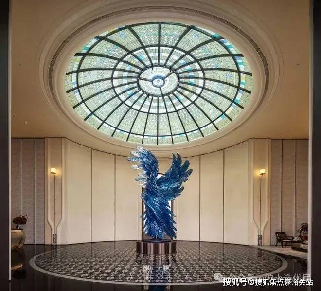 彩绘玻璃穹顶漫射柔和天光,艺术拱门与浮雕墙面交替排列,中央紫蓝渐变花艺装置描摹四季流转之美,可上演私享音乐会、业主演说会、亲子读书会、浪漫下午茶等,复现百年和平饭店的顶层社交场景。