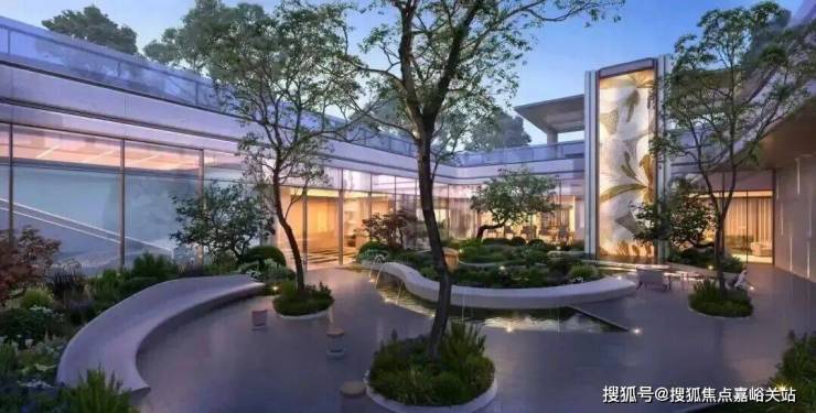 穿过会所,便步入层层叠水、绿意环绕的下沉庭院。