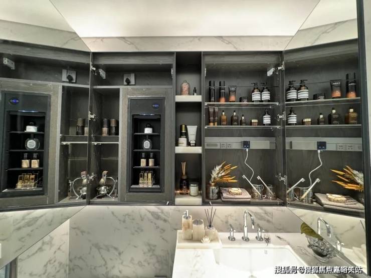 双卫配置,其中一个做了干湿分离,科勒台盆+双智能马桶+高仪花洒,除雾镜柜均内置了牙刷消毒器、预留吹风机插座。主卫镜柜还有美妆冰箱,收纳空间相当充足。