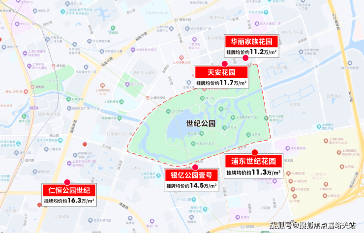 就拿世纪公园来说,以这座公园为中心,周边的房龄在20年以上的二手房挂牌均价起码都在约11万+/㎡。