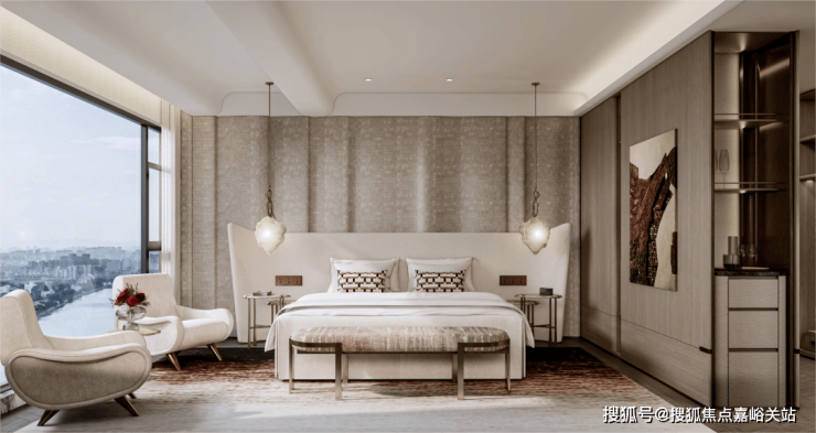 主卧拥有270度环幕飘窗,视野和采光优越,配备了高奢卫生间,空间感、尊崇感拉到顶格。