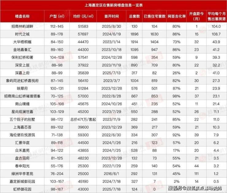 进一步观察在售项目,当前嘉定在售的22个新盘中,仅有招商林屿湖畔和时代之城两个项目表现突出,月均去化超过了100套; 其余19个项目月均销量普遍低于50套,不少楼盘甚至难破20套。