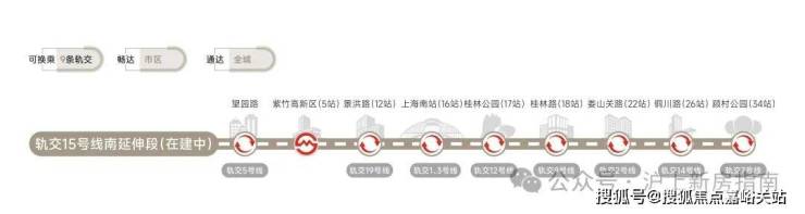 轨交网络:5号线、15号线南延伸段(在建中)、市域嘉闵线南延伸段(规划中)、沪乍杭高铁(规划中)及南枫线(在建中)