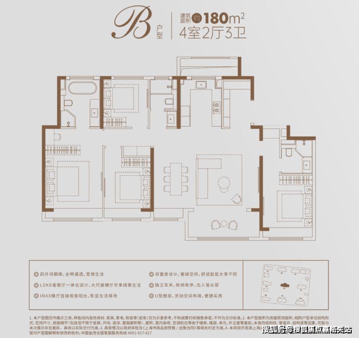 五开间朝南的全明通透,四房两厅三卫,双主卧设计,舒适起居大享不同,使得其居住感相当阔绰,为生活增添更多情景体验。在精巧铺排上,LDKB客餐厅一体化设计,大尺度横厅尽享阔景生活;动线合理的基础之上,户型格局方正,赋予生活幸福美感。