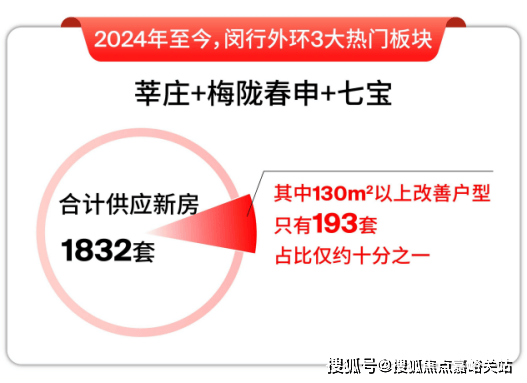 据网上房地产数据显示,2024年至今,闵行外环3大热门板块莘庄+梅陇春申+七宝合计供应新房1832套。其中建面约130㎡以上改善户型只有193套,占比仅约十分之一!而这3个板块都是闵行发展多年的醇熟板块,板块内积攒了大量的改善置换需求,改善市场面临的是强烈供不应求的态势。换言之,闵行外环附近热门板块的改善型产品本身就是多年难遇的稀缺品!