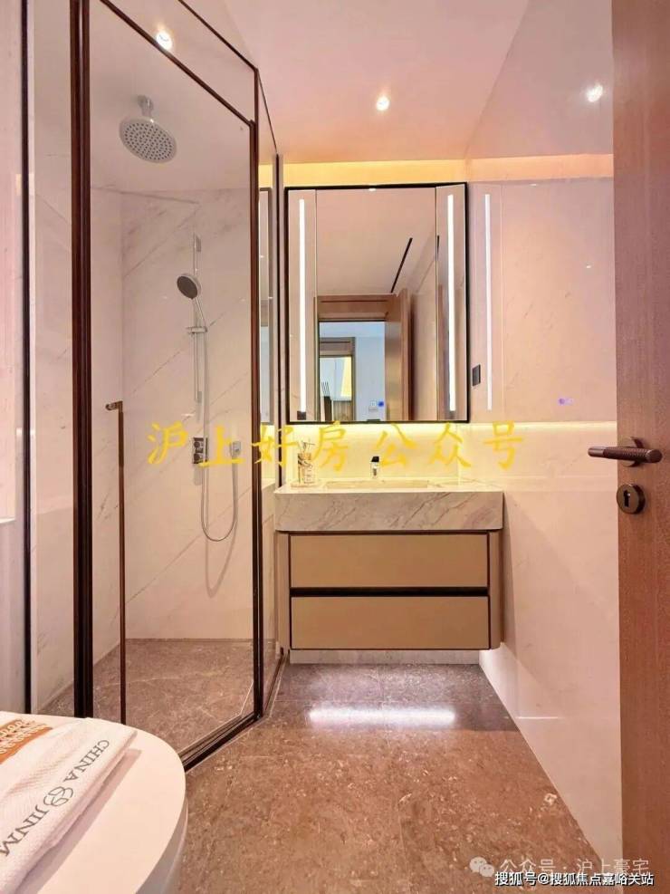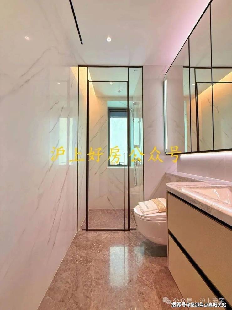 另外,卫生间也是配置拉满,劳芬的马桶、当代的龙头、内置美妆冰箱的镜柜、大理石的地面、江南烟雨奢石的墙面一应俱全!