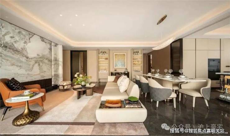 餐厅区域打造了整面墙的餐边柜(交付标准),中间是弧形的芬迪白奢石背景墙,工艺复杂,视觉效果非常震撼