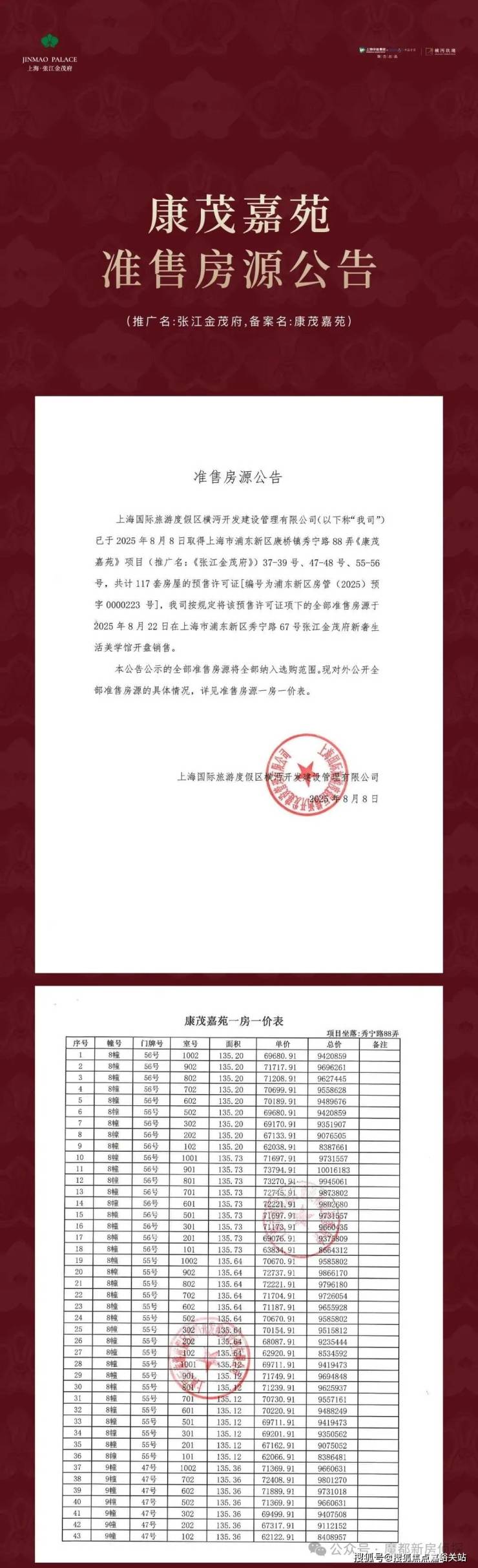 最新消息,张江金茂府!偷偷的来了!浦东首座金茂府,一房一价表首发!建面约92-138㎡3-4房整盘联动价约6.8万/㎡.实际6.7万/平,