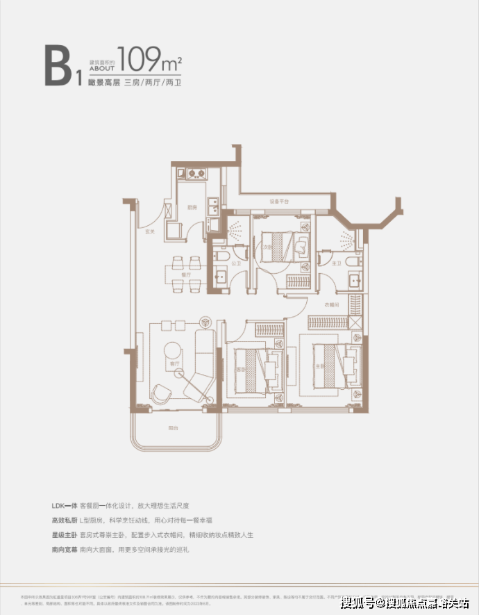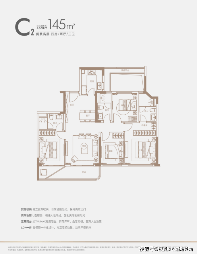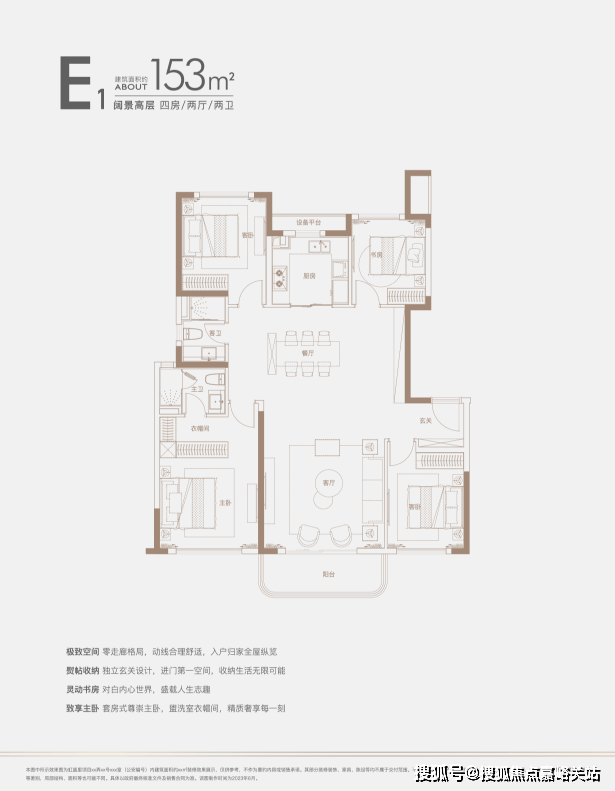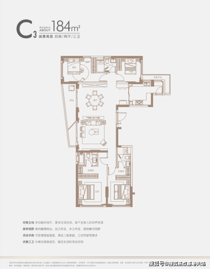 建面约140㎡四房:三开间朝南户型,南北通透,采光条件优质,客厅明亮宽敞,彰显大气布局。
