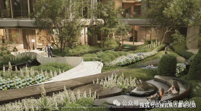 在全域抬板约4米的基础上,项目又下挖,形成罕见垂直落差。依托这一独特地形,项目打造“沿街古树花园+板上浮空花园+板下流石花园”的多层立体景观体系。