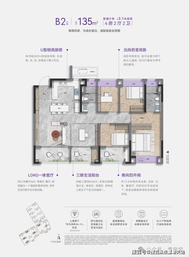 我们以135m²4+1房户型为例: