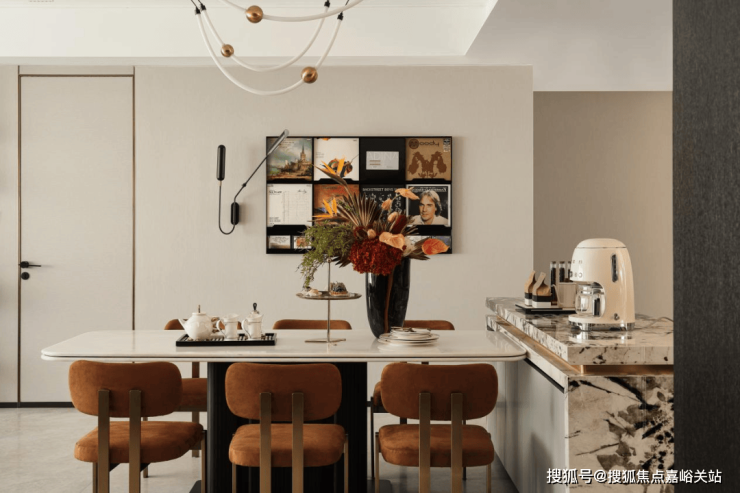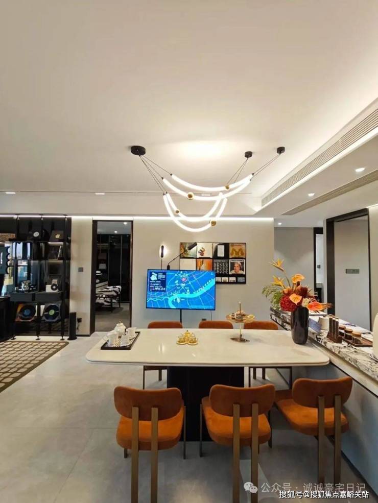 项目设计师的理念是“真正的奢华是自由”。超大的方厅,面积近50㎡,面宽约5.4 米。这里可以轻松实现电器柜、岛台、长桌、沙发、钢琴等丰富的生活场景。