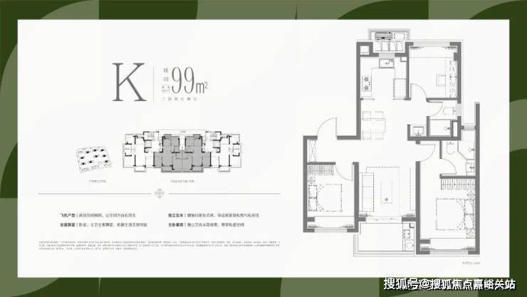 实现了大面宽横厅的飞机户型设计,使得南向的开间,全部布置为客厅、主卧和次卧三个最重要的功能区;北向房间则布置了次要的厨房、次卫、书房和主卫功能,最优化的提供南向面宽和缩窄户型整体进深,提升户型整体的采光和通风。