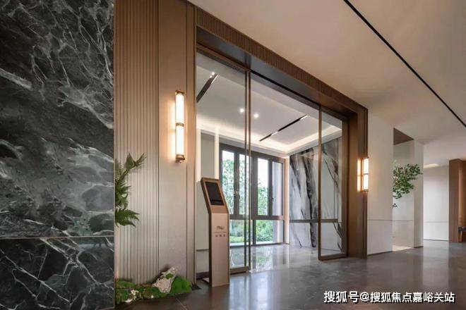 架空层入户门厅处,以普拉达绿奢石为背景装饰,提升了整体空间的质感,结合金属铝板装饰搭配,归家仪式感满满。