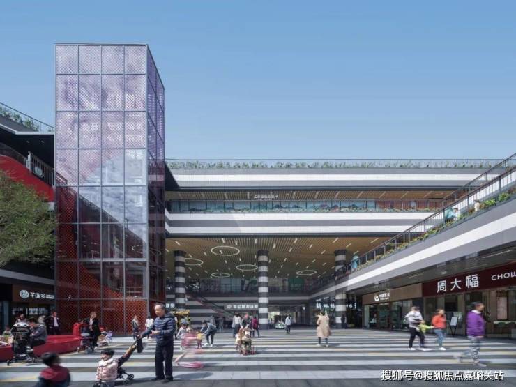 新环广场古今融合的设计理念体现在退进的首二层体量上,参照邻近旅游古镇新场亲密、友好的尺度。为最大化商业的曝光点,柯路设计了标志性的环形体,降落于屋顶上方,其下是条理清晰、人气交融的街道景观。