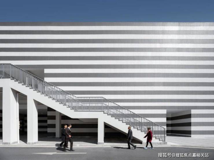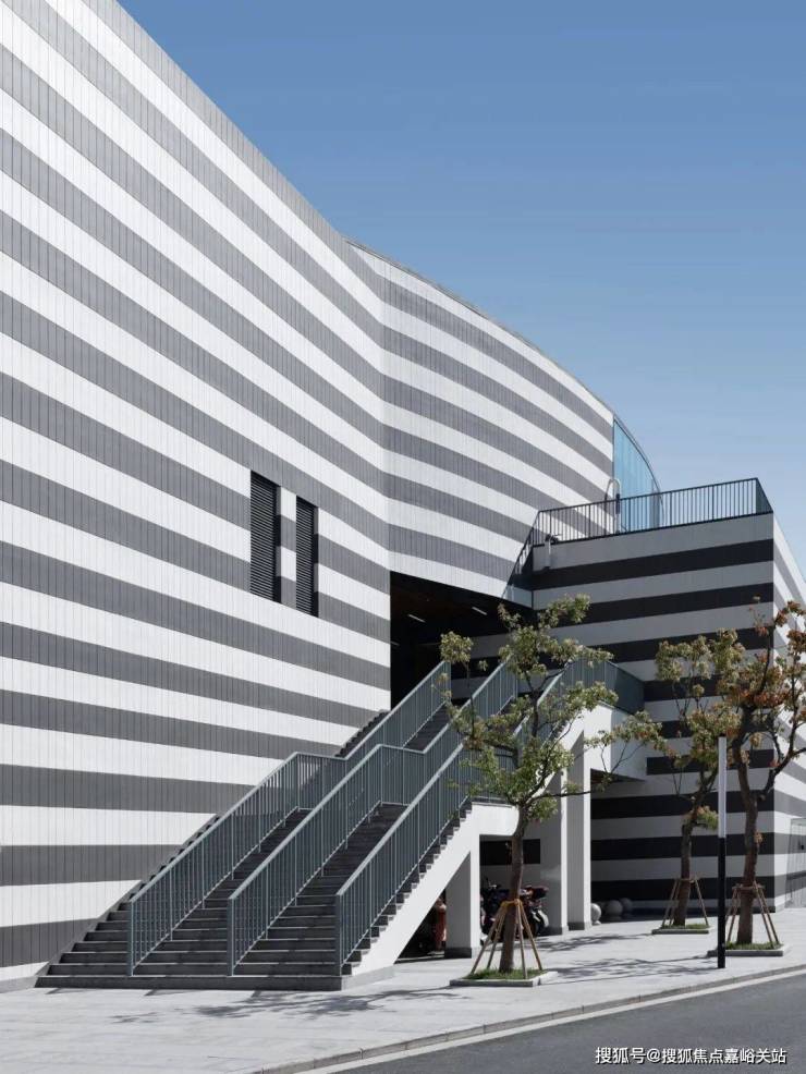 顶部的圆环体量幕墙采用压花玻璃,通透的材质特性使访客可享受到立体的建筑平台与周遭的城市景观。而低区的黑白陶土挂板线条则以现代手法抽象表现“上海石库门“这类历史传统砖墙建筑的特征。