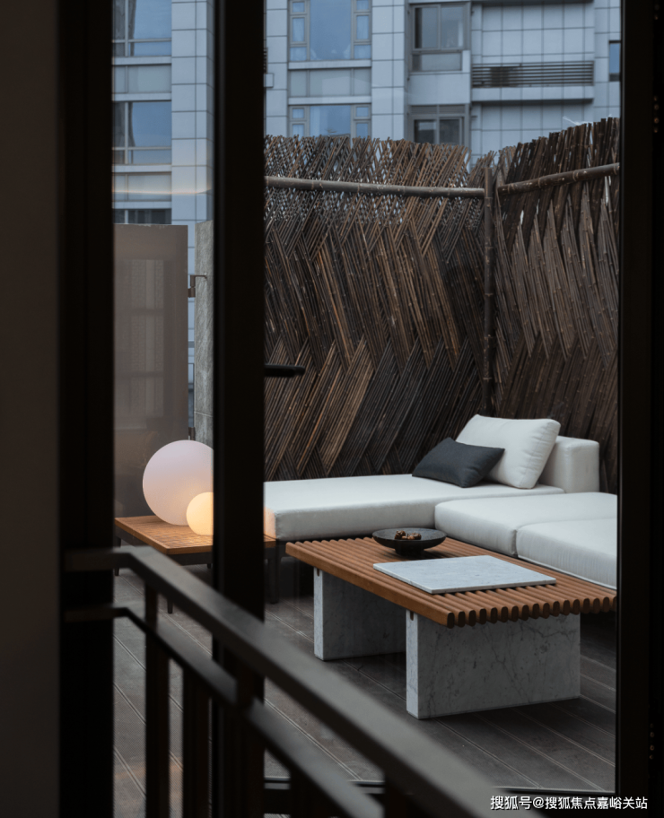 沿着空间缓步而行,便可推门而出,步入户外的露台。此处,作为另一片亲密而自由的天地,悄然展开了社交与沉思的双重场景。日落时分,天光由浅入深,云霞轻染天际。暮色微垂之际,壁灯缓缓亮起,温柔的光晕洒落在石材与木地之上,静静描绘出夜的轮廓。微风轻掠过衣角,带来草木低语,室内的繁华在此远远褪去,只余下心灵间的松弛与纯粹。