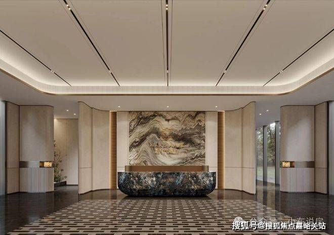 顶部香槟金造型的异型铝板精致典雅,搭配手工打磨的璀璨星空顶,仿若将银河纳入社区;地面仿石砖沉稳大气,与墙面汲取华尔道夫酒店精髓的浅米系大理石贴面相得益彰,营造出优雅静谧的氛围。