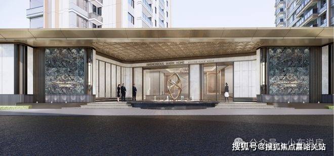 同时,入户大堂立面造型延续了主立面的框与线结合,飘顶弧形雨棚,组成高定入户大堂,增加入户仪式感。