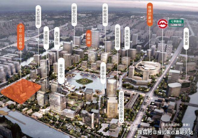 地铁方面:「中企云启春申」直线距离地铁12号线+嘉闵线(在建)双轨交枢纽七莘路站仅约900米。