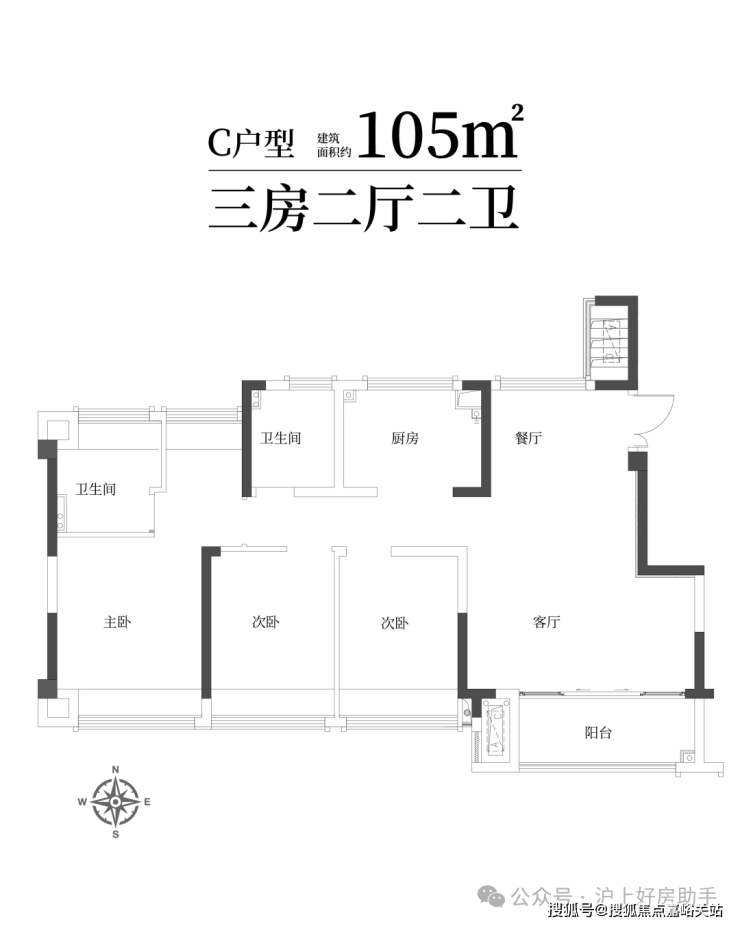 建筑面积约105㎡宽厅三房两卫 ,四开间朝南,舒适栖居理想
