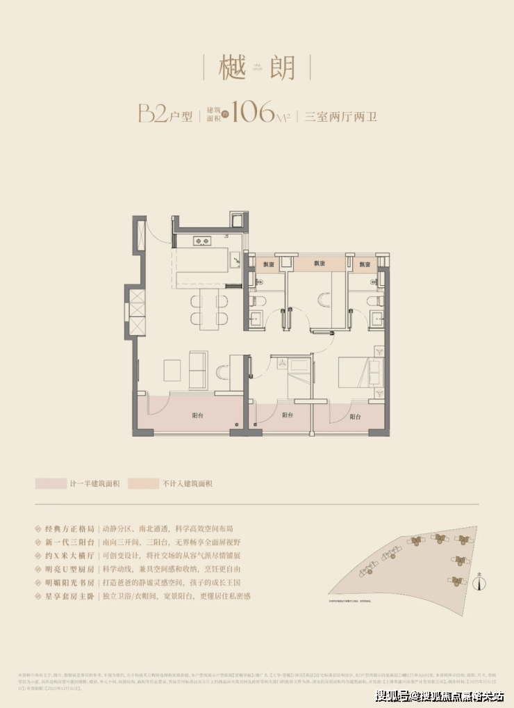 建面约106㎡的三房两厅两卫, 3.5开间朝南,南向面宽达到约11.8m! 碾压市面上以前的三开间朝南、10米面宽的三房户型。