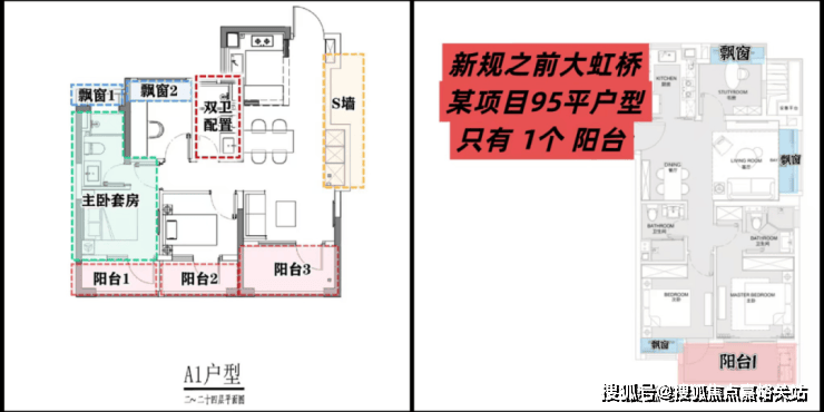 在这里,高层建面约94㎡户型做到了惊人的 三阳台, 对比同板块内以前的标杆小区,同面积段户型只做了1个阳台。不仅数量发生质的变化, 实得面积 也大大增加。