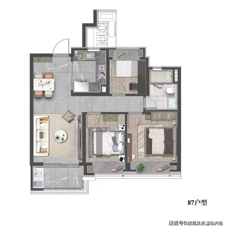 建面约87㎡3房2厅1卫户型图: