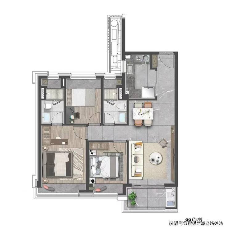 建面约99㎡3房2厅2卫户型图: