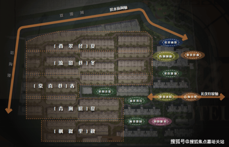 项目利用滨水环绕的特点,规划有 “十大剧场、五大主题街巷”的景观概念,为业主带来尊崇感、仪式感兼备的归家体验。