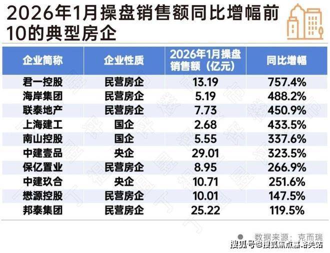 百强房企中业绩同比增长企业共有32家,其中同比增幅大于100%的企业数量有10家,其中6家是民营房企,部分企业业绩大幅回暖。销售增幅前十的房企中中建壹品和邦泰集团都进入了操盘销售TOP20,尤其是民营房企中的邦泰集团,2026年业绩进一步增长,这主要是得益于企业自2021年以来的大规模错峰投资,从而迎来了规模的跃进。