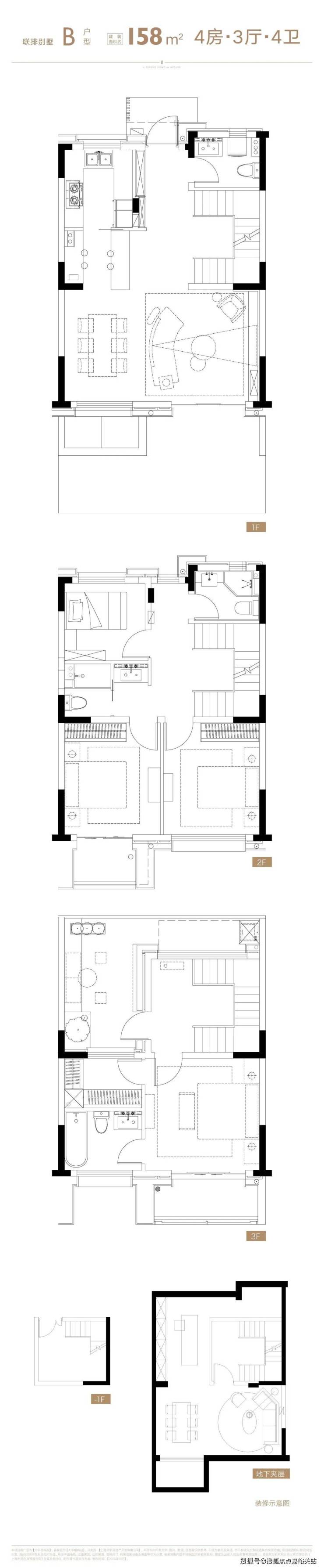 下叠户型4房2厅3卫,一层会客区,二层居住区,附带地下空间,可以根据主人喜好,定制成如健身房、酒窖、影音室、台球房等,任凭想象。