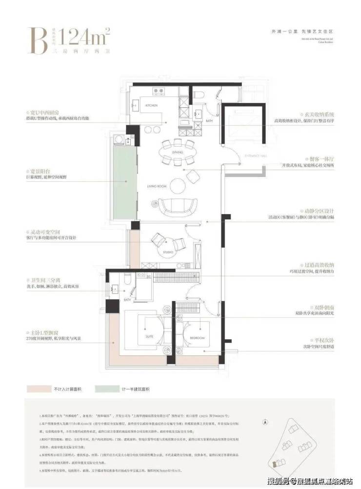 建面约124㎡的边厅“全景舱”户型,是外滩板块极致稀缺的臻品。它以三房布局满足主流家庭需求,更以无遮挡的视野与巨幕般的边厅落地窗,将城市天际线化为私藏画卷。主卧270°L型飘窗,让阳光与风景成为生活的主角。