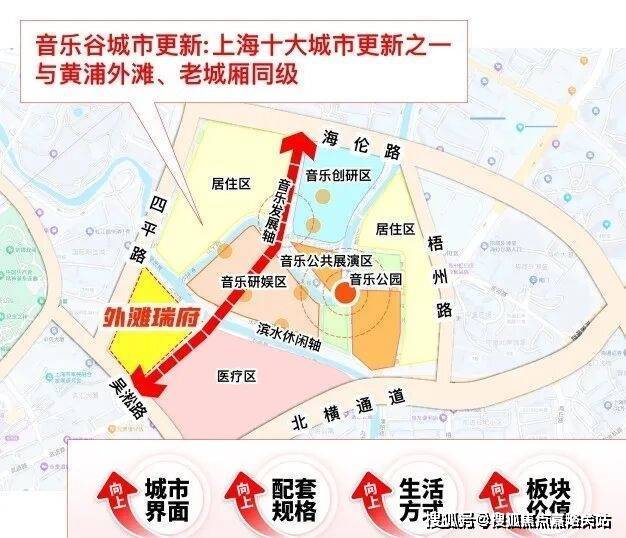 旁边还有上海首批十大城市更新单元——虹口嘉兴01单元。这个单元是内环少有的“完整水系风貌更新区”,未来将依托虹口港打造“一湾两半岛”,定位“东方百老汇”:滨水步行道连贯成片,百年石库门里弄变身爵士乐演出场地与独立艺术画廊,滨水市集的霓虹与水岸光影交织,形成“生活为体,音乐为魂”的海派艺文场景。这种“历史+生态+艺文”的高级烟火气,是传统豪宅区没有的,住这儿不是“看风景”,而是把生活过成“未来艺术化剧场”。