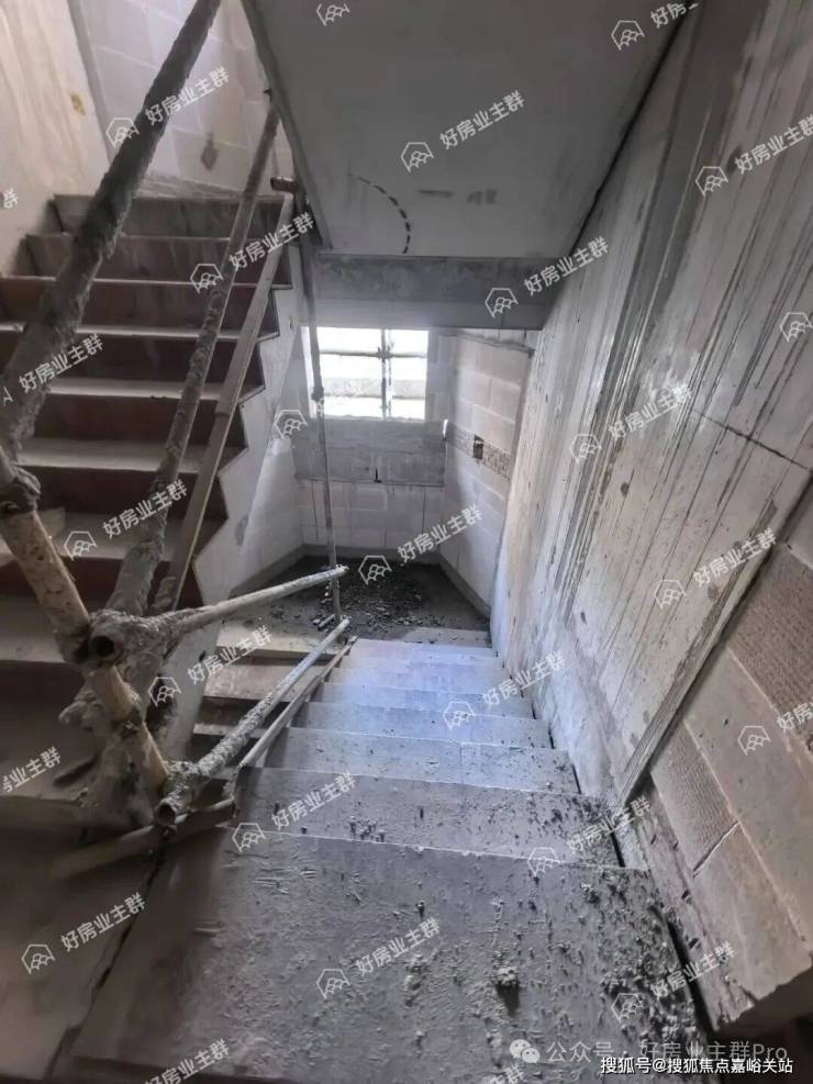 消防楼梯间墙面未粉刷,栏杆扶手为临时架设;侯梯厅隔墙已砌筑,电梯门尚未安装。