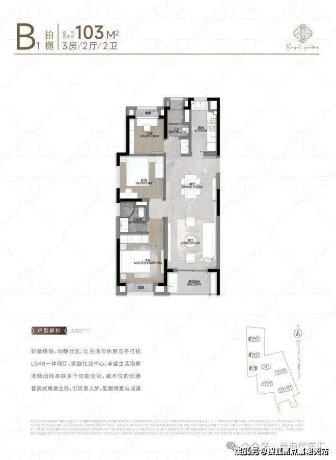 建面约100-103㎡的三房B户型,全明空间,尺度舒适,功能完备。开阔的空间格局,每日与阳光清风作伴舒适惬意。三房设置,✅✅静安玺樾售楼处电话:400 - 882 - 4258✅✅满足从小太阳家庭到三代同堂的全周期家庭需要。