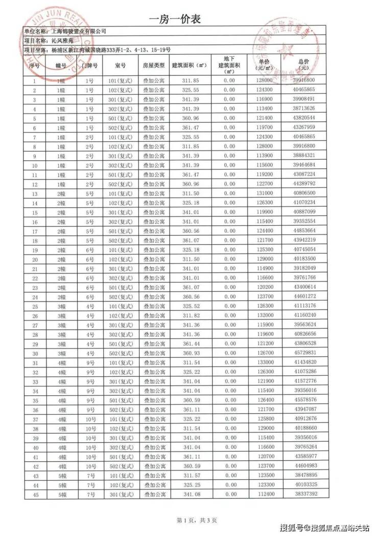 项目一房一价表:
