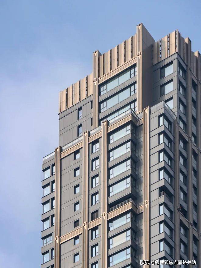 沿用古典三段式美学,超高层形体挺拔,通过顶部退台与金色塔冠强化形体的标志性。立面以沉稳的周边环境色为基调,以金色竖向人字形线条勾勒精致细节,营造典雅、尊贵且向上的气质。