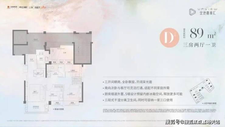最后是D户型,不到90㎡直接3房一步到位,降低了刚需客户的上车门槛;三开间朝南+LDK一体化设计,采光性能优异,视野开阔;全卧飘窗,干湿分离卫生间,烟道外置,S墙内嵌设计,更大程度的增强空间利用率。